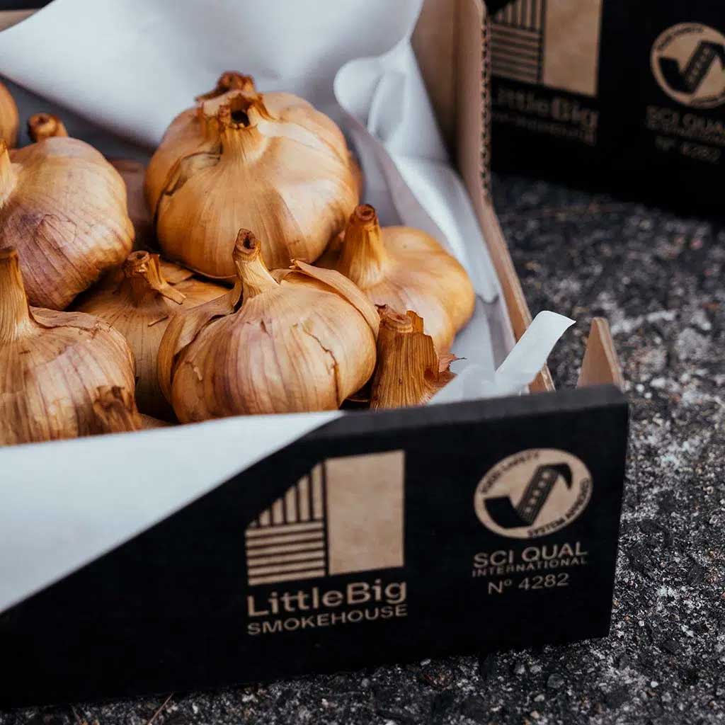 Each bulb of our cold smoked garlic is carefully sourced from regions renowned for exceptional garlic, including Argentina, Spain and Mexico. After meticulous hand-sorting, the garlic is slowly cold-smoked for a minimum of 72 hours. This process turns the bulbs a rich golden colour and infuses them with a distinctive, well-balanced smoky flavour.